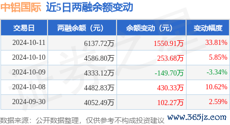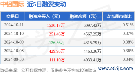 本站音书,10月11日,中铝国外(601068)融资买入2511.14万元,融资偿还980.97万元,融资净买入1530.17万元,融资余额6097.42万元。