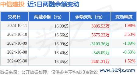 本站音问,10月11日,中信建投(601066)融资买入3.6亿元,融资偿还3.27亿元,融资净买入3337.87万元kaiyun官方网站,融资余额16.97亿元,近20个交游日中有12个交游日出现融资净买入。